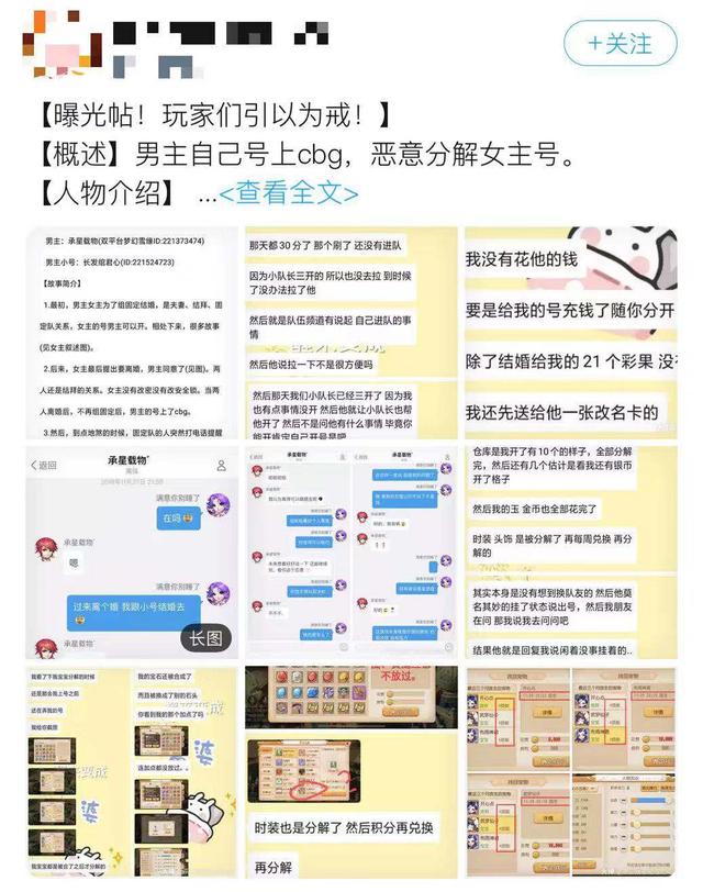 据悉,男方与女方是夫妻、结拜、固定队的关系。后来女方因为个人原因想要离婚跟小号结婚,并且男方也同意了。只怪女主太单纯,自以为是朋友,所以在离婚后也没有改密码,更没有改安全锁。正因为此,男方在事后登了女方的号,并且恶意分解女方号,毁得干干净净,不仅装备、时装被分解,就连宝宝都没有放过,直接合宠后再放生,一身的金币和仙玉更是荡然无存。女方看到自己辛辛苦苦打造的账号成了如今的状态,一度气到崩溃。