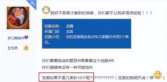 另外就是龙宫奇经八脉的调整,秒10不在是几率!如果这个消息是真的,那么义气龙将会迎来春天。毕竟秒7已经很恐怖了,这要是能秒10,其他法系还有活路吗?