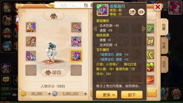 衣服:衣服的搭配有许多种,可以根据自身的装备属性和玩家自身喜好选择佩戴宝石。偏辅助门派玩家可以选择一个月亮石一个翡翠石,分别增加物理防御与法术防御。也可以镶嵌一个翡翠石一个昆仑玉或一个月亮石一个昆仑玉的搭配,既增加了防御也增加了治疗强度。