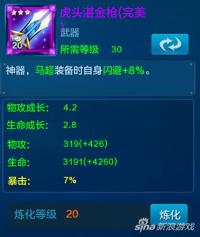 本次更新后,恰好周热点是马超专属武器-虎头湛金枪,不仅属性成长非常高,而且马超装备后,还额外增加8%闪避,配合四技能铁骑的S型走位,简直是想被人打到都难!(【小提示】:其他英雄也是可以装备虎头湛金枪的,只是没有专属属性了哦)