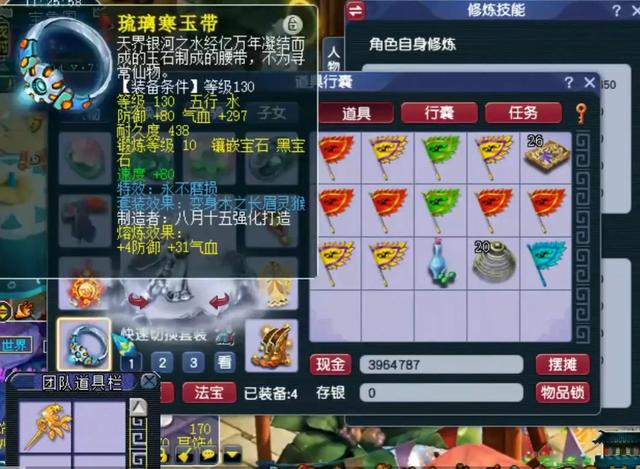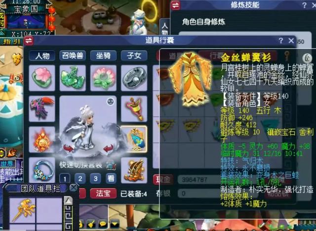 附加逆天双蓝字的140级女衣,特技气归术,特效永不磨损,点化了巨蛙套装效果,单加魔力38,综合防御246。