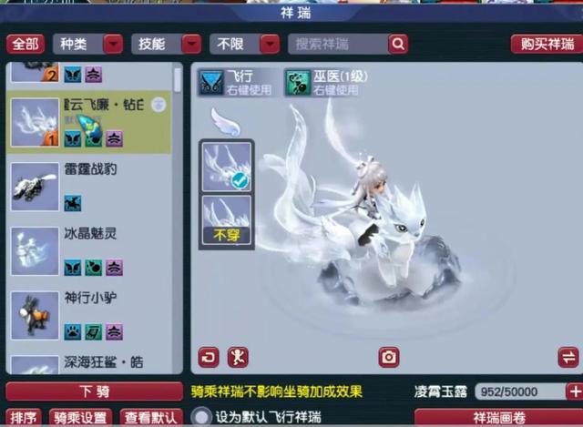 从锦衣祥瑞的配置就不难看出号主就是一位富婆,飞廉新祥瑞更出来就被她入手了。其它限量祥瑞还有冰晶魅灵、海豚恋人、神行小驴以及深海狂鲨等。