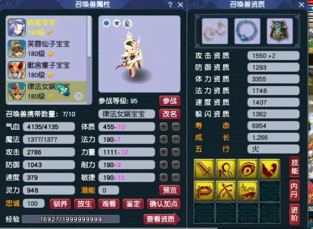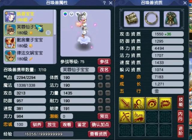 最具有个性的就是上面展示的两只攻宠,本来律法以及芙蓉仙子的天赋技能都是很少的,但打造出来的达到了6、7技能。尤其是芙蓉仙子,攻击资质1586,成长1.271,攻击属性高达3213,这应该是目前全服资质最高的芙蓉仙子了。
