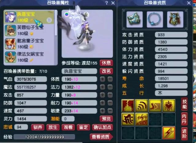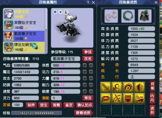 攻宠方面,8技能全红连善毗舍童子,进阶之后的攻击资质1710,成长1.297。