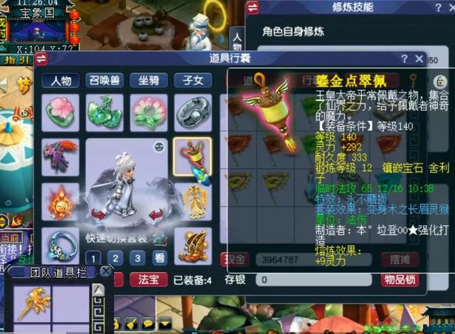 现在来了解一下这位富婆配置的装备,先展示的是140级项链,附加永不磨损特效的长眉灵猴套装,熔炼灵力9点,综合灵力为292,初始灵力达到了220,一件高属性的不磨装备。