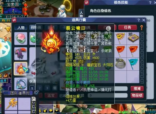接着就是武器的配置情况,一把140级宝珠武器,拥有缺少不了永不磨损特效,单加魔力33,锻炼了9段太阳石。武器最终的伤害为600,命中525。
