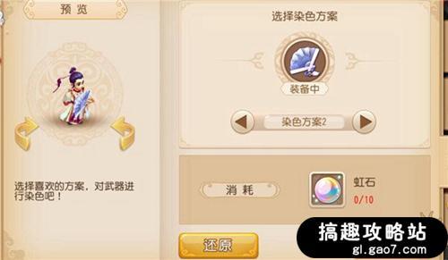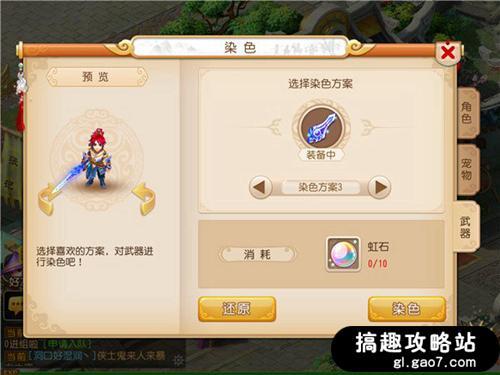 只要是60级以上的武器,花费10个虹石,去长安配色师那染色就行了。跟彩果染色的操作差不多。武器染色纯碎是改变外观颜色,没其他附加属性。