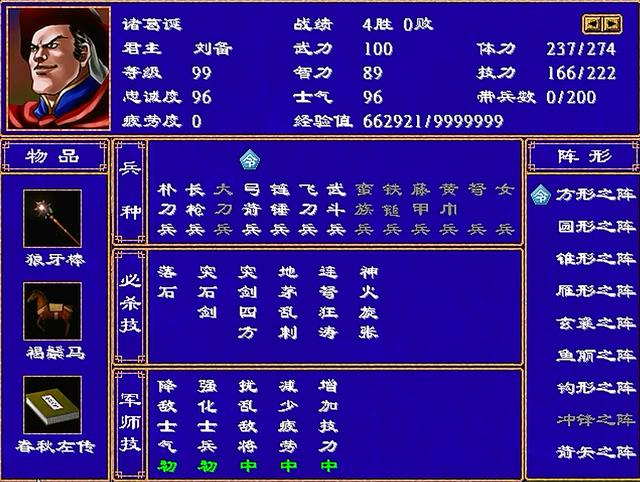 军师技6个:1级的后选出阵,8级的增强攻击(初),14级的喝阻敌军(初),22级的太公阵,29级的恢复体力(中),35级的增加体力(中)
