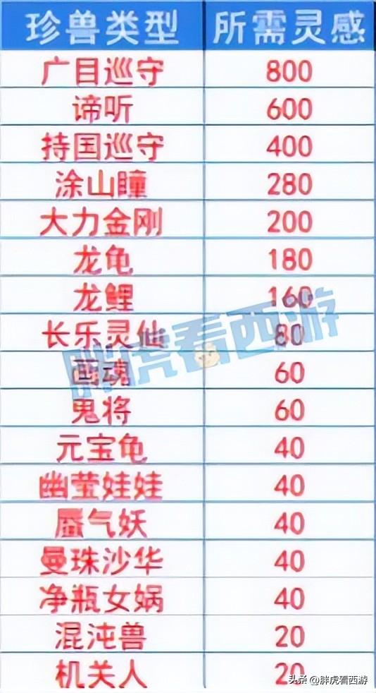 以下是每种召唤兽对应的灵感值。