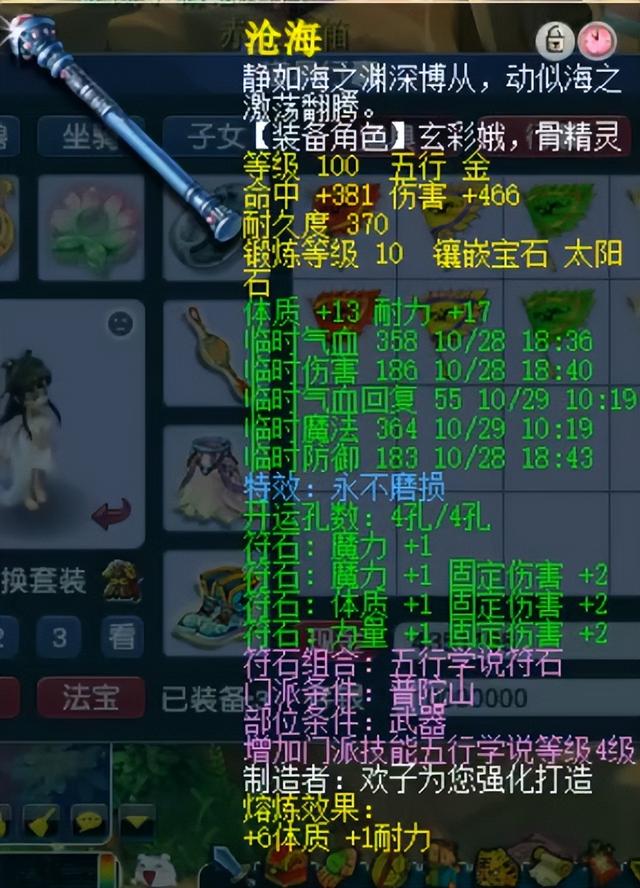 发钗部分为100级10锻不磨,虽然基础属性颇为不错,但想要极致固伤的话,还是换成太阳石比较好。