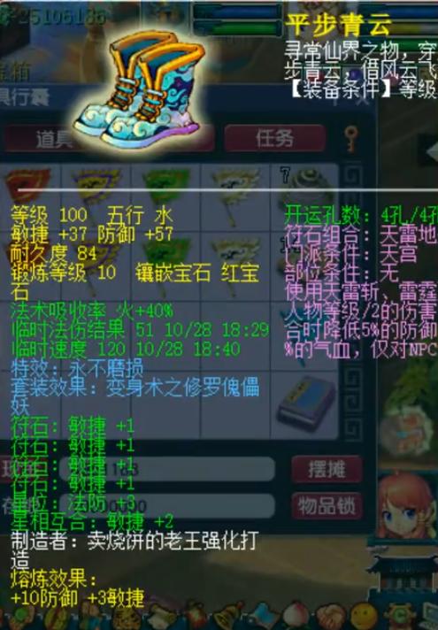 鞋子部分为100级10锻不磨,虽然熔炼后防御属性不错,但敏捷着实低了点。