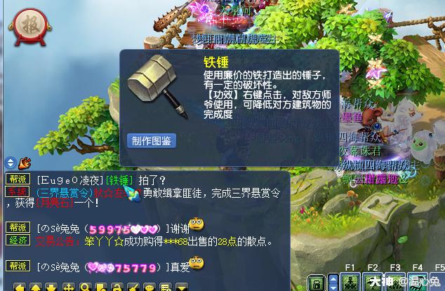 1、比赛期间战胜任意一个伐木工均有几率获得"铁锤"道具;成员可右键点击该道具对敌方"帮派师爷"使用,可降低敌方建筑的完成度(每60秒破坏一次);