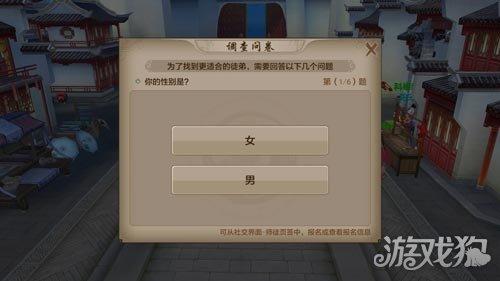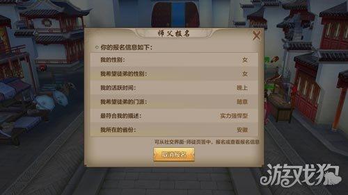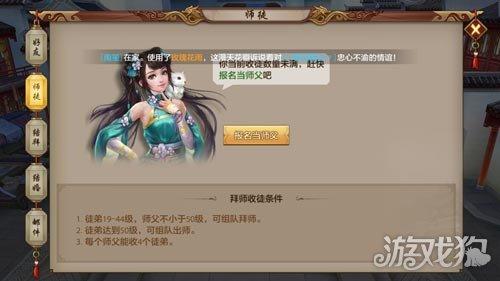 当你的等级达到五十级之后你就可以报名当师父收徒弟啦,每个师父最多能收四个徒弟。而当徒弟的等级达到五十级之后就而已出师了,怎么样你想不想让你的门派发扬光大。点击报名之后系统贤惠给你一个问卷调查,用于更好的寻找徒弟,以及徒弟找到适合自己的师父。