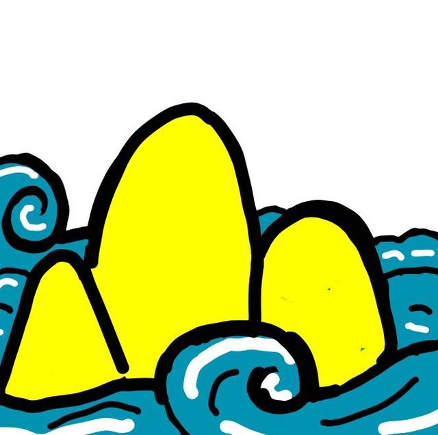 这个又会是什么呢?三座黄色的山矗立在大海里?