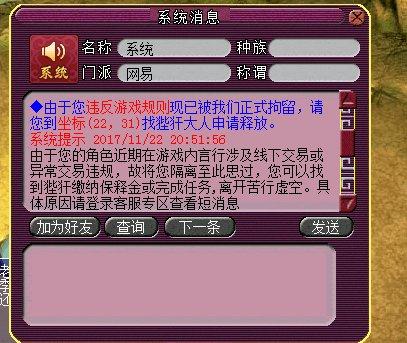 系统消息通知,这位梦幻西游玩家在游戏内言行涉及线下交易被苦行。