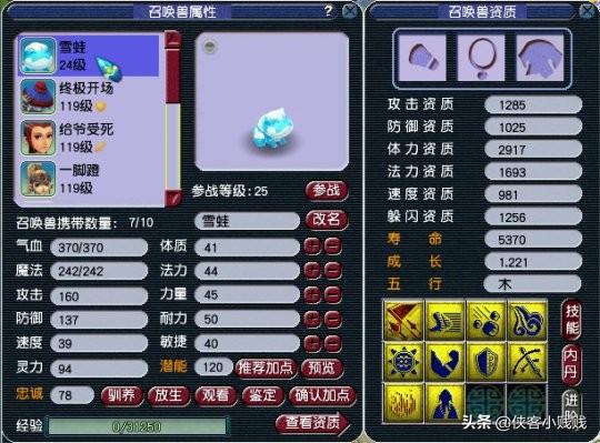 有玩家炼妖出了一只10技能雪蛙,作为一只个性宠来说,这只宝宝资质十分不错了,成长高达1.221,攻击资质1285,而且元宵和真经都还没吃。