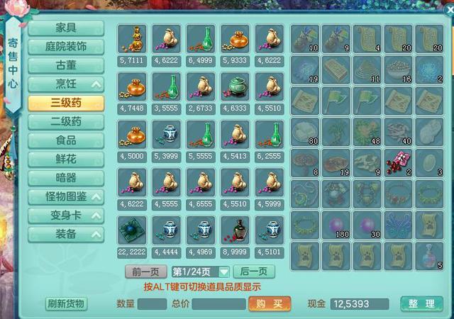 但其实,诸如三药、二药、烹饪和家具,都可以从左侧的物品寄售中心(Alt+J)直接获取,而不用使用飞行旗到长安城的交易中心购买所需物品。