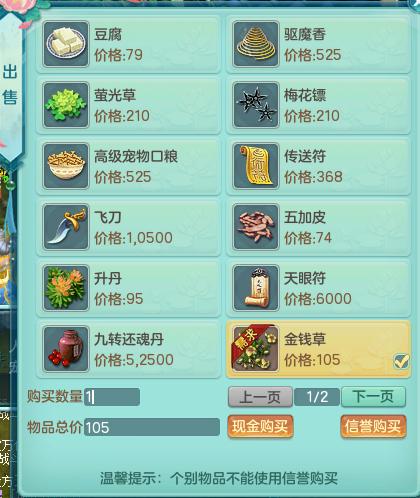 如果是物品寄售中心所没有的道具,比如一级药,五加皮或者豆腐。玩家可以学1-2级的天仙店铺,这样就可以在天仙店铺购买所需物品,而不用专门使用飞行旗跑去长安药店里找药店老板。