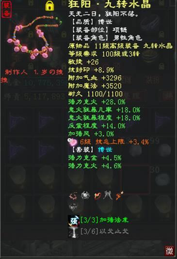 其次说武器炼器几率必须9,+原始几率一共21,搭配几率+程度+克项链,+护身符7.5左右几率刚好80,也可以项链选高几率+克,护身符就舍弃几率换克或忽视,几率在85-90之间,忽视或克会高但是少19程度(最大)。