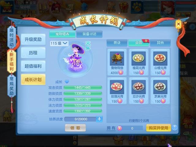 预培养并不消耗小伙伴们积累的铜币、银币等资源,而是通过每次升级获得储备积分,利用日常活动获得的活跃进行转化,将储备积分转换为积分即可在宠物培养处消耗使用,获得页面中的宠物培养道具。其中不仅有提升资质的元宵和宠物饰物,还有兽诀等物品。对了,消耗积分还能获得成长进度,在小伙伴们的角色等级达到携带等级、且培养进度满足条件时就可以将宠物带回家了。