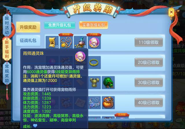 之前大家升级到70/90/110级时会赠送的宠物通灵珠,在这次更新中被取消了,取而代之的是拥有更多福利的“宠物培养”页面。这是一个预培养的玩法,小伙伴们50-90级期间可以在这里培养幽灵虎,70-110级期间是龙虾骑士,而90级会开放雨师的预培养。