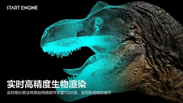 那么,START ENGINE是如何做到的?首先, 在生物渲染上,如《EVOLUTION · 进化》中的恐龙,利用的是自研的实时细分处理方案,将影视中的模型细分技术运用到实时渲染中,同时将这部分压力较大的工作转移到专属卡上执行。这样在阳光照射下,恐龙的皮肤会显得细腻且有光泽,以此细节强化玩家游戏体验。