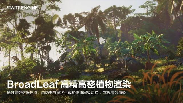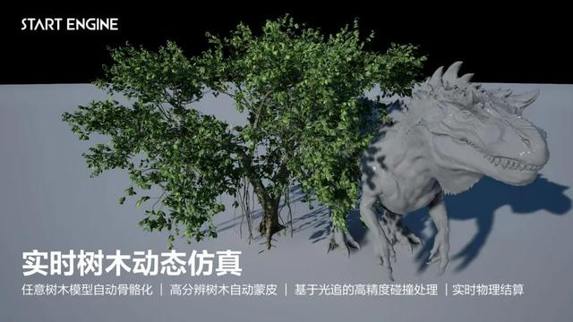 此外,仿真部分,START ENGINE针对不同的物体如树木、水等采用了不同的技术,以体现现实世界树木与水最真实的交互效果。如实时树木动态仿真和GPU加速的实时流体仿真技术。