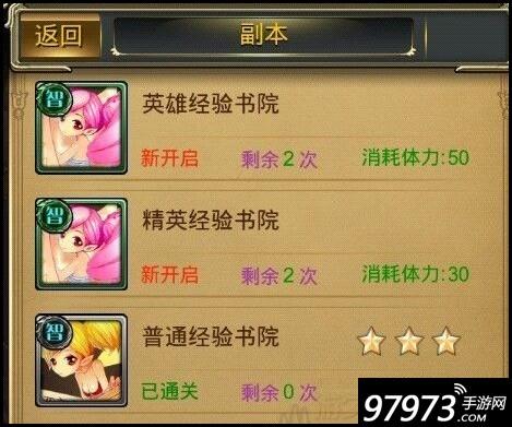 3.经验书院:普通经验书院每次15点体力,精英经验书院每次30点体力,英雄经验书院每次50点体力。