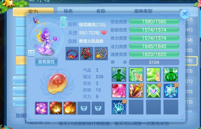 看了两个六技能宠物,我们再来领略一下画龙点睛区服第一桂花的魅力。这只桂花精灵每个资质都在1570以上,甚至法术资质和速度资质都在1620以上,资质方面堪称恐怖如斯。而在技能搭配上,同样也是可圈可点,双克制的搭配让其战术目的更容易达成,对于肉盾型宠物的伤害能力大幅度提升。