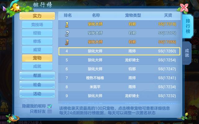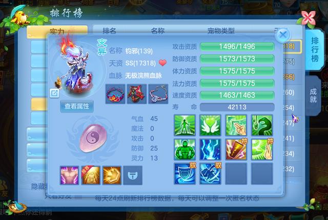 钧邪是飞升宠物,作为六技能资质方面分布较为平均,给了大家多样的宠物打造思路,而在成长上面相比龙虾雨师也有领先,因此正在逐渐成为高等级玩家们的主力作战宠物的新选择。我们接下来要看的宠物来自歌舞升平区服的宠物排行榜第一,评分高达17318。资质方面法力资质、体力资质、防御资质均超过了1570,另外攻击资质也接近1500,不可谓不优秀。主人将其打造成为了标准的血毒法,利用高级法术连击提升高级毒的触发几率,克制对方保命技能,配合着血宠的生存能力,持续输出能力比较强。而且小技能审判也可以克制对方的神佑技能,成为宠物收割机并不过分。