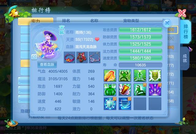 雨师是115等级段的宠物,最多可以拥有六个技能,是高等级玩家参与诸多玩法的主要战斗力。本次我们要看的这只雨师是前不久刚刚登上天下无双区服排行榜第一名的宠物,恐怖如斯。首先我们来看这只宠物的资质,攻击资质1612提供了出色的伤害基础,另外体防资质都在1500以上,使得宠物在输出之余也拥有足够的自保能力。基于这样的资质,宠物主人将其打造成为了三围剑气宠物,所谓"三围"就是在攻击、防御、气血三个方面都兼顾,非资质出色的宠物不能选择。高级必杀+高级强力+剑气四射的输出组合能够让其在各种玩法中都展现出强大的作战实力。