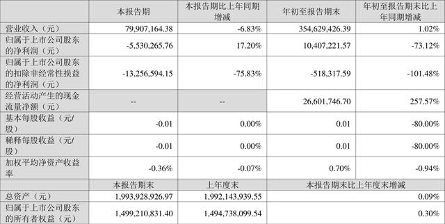 根据三季报,公司第三季度实现营业总收入7990.72万元,同比下降6.83%,环比下降60.30%;归母净利润-553.03万元,同比增长17.20%,环比下降125.35%;扣非净利润-1325.66万元,同比下降75.83%,环比下降165.09%。