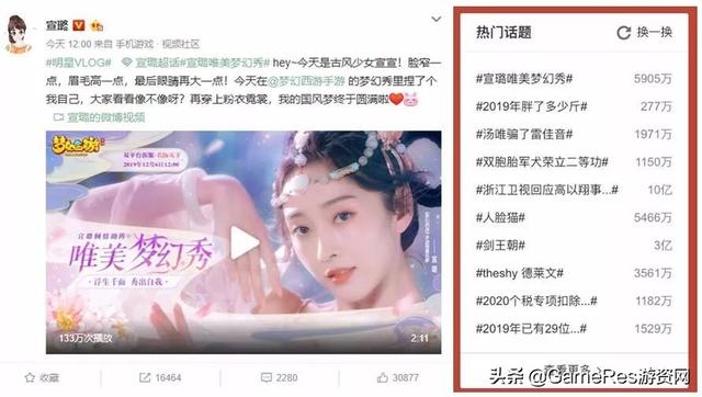 围绕“梦幻秀”玩法,《梦幻西游》手游与明星玩家宣璐进行了一系列合作,以游戏坚持传承的国风为切入点,通过画面绝美的视频表现力,用各具风格的视频内容精确切入抖音、微博等社交平台,在玩家社交网络形成了强有力圈层穿透效果,视频内容一经推出即获得玩家和粉丝的强烈欢迎。而作为此次出镜的明星玩家,青年演员宣璐在2019年因饰演年度热剧《陈情令》中云梦江氏大师姐——温婉柔美的江厌离一角而大火,社交平台粉丝破千万,作为娱乐圈极具粉丝号召力的新生代实力派演员,巨大的行业影响力为游戏合作带来强大的流量支持。