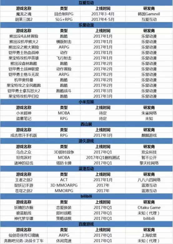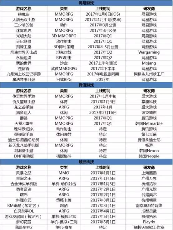 而在2017年的游戏产品发行计划中,不难发现,有少数厂商的产品未能如期上线,并顺延至2017年Q1,也有不少产品在2017年的发行时间处于待定状态。这或许与2016年施行的版号新规不无关系,版号实施过程较慢导致部分产品版号过审,推迟上线;同时,厂商自身策略的调整也可能导致部分产品延迟上线,这也属于正常现象。