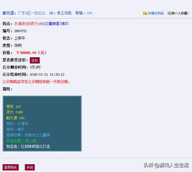 小编在藏宝阁搜索了一下,这位玩家是来自于“广东4区-白云山”的玩家.只不过号主把套装“混沌兽”洗成了“炎魔神”。并且以“28888”元的价格上架,目前还在公示期。