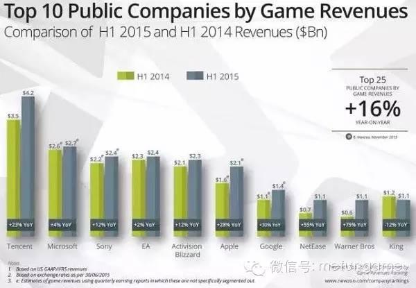 这是一张来自Newzoo的全球前十最高收入的上市游戏公司排行榜,2014年 和2015年第一季的收入对比。腾讯、微软、索尼排名前三,在排名前十的上市游戏公司中,只有《糖果传奇》开发商King是唯一一家以移动游戏为主要产品的公司,但也是唯一一个收入同比下降的公司。然而三天前的一个收购让这张榜单发生了显著的变化——动视暴雪收购King,一跃成为全球收入第二的游戏公司。同时高达59亿美元的收购价,也让它成为业内2015年的头号大事件。