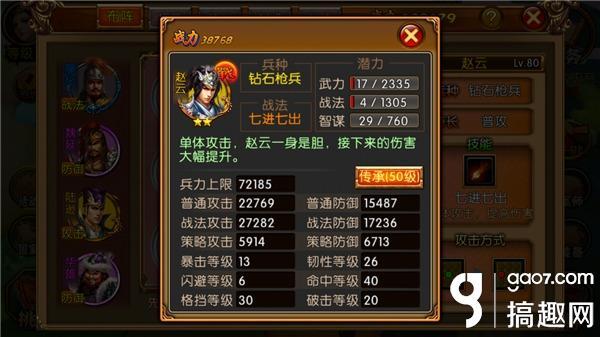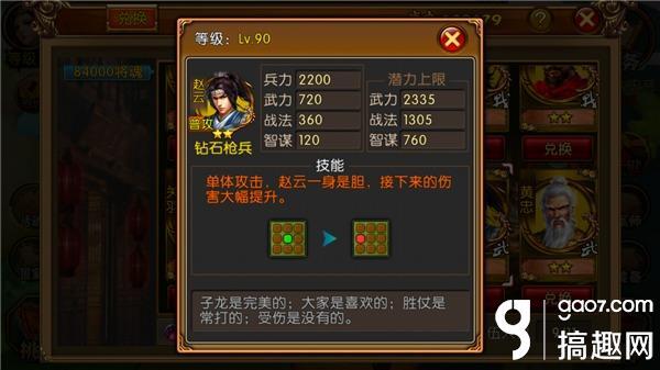 玩家在酒馆招募武将的时候,点击武将头像可以查看武将的7项属性,例:根据下图,我们可以看出来赵云是个普攻2星金将,以及兵力等,玩家可以根据以下信息判断该武将是否玩家所需。
