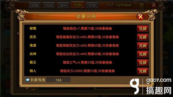 为了增加兵力和普攻,卦象方便我们可以给他佩戴霸王、武圣、御人。潜力则主要培养武力。武将搭配,为了平衡,赵云前面需要放一个肉(兵力高的武将来抵挡伤害)。