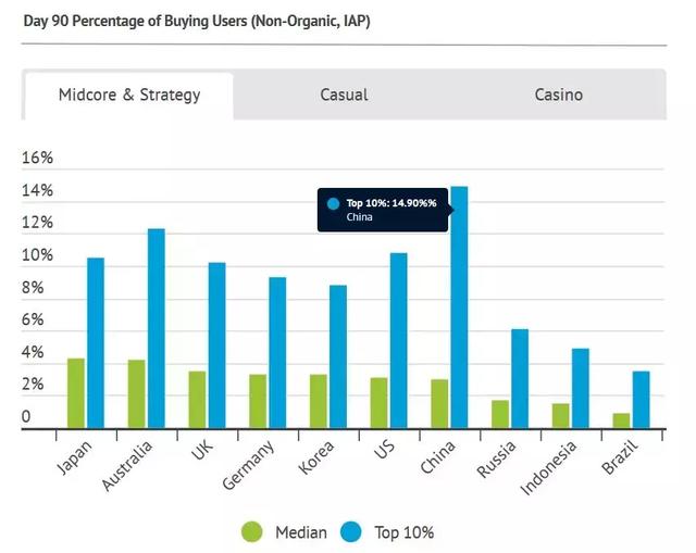 然而,中国市场的游戏用户付费率呈现出极其不平衡的状态,头部手游拿下了绝大部分付费用户。中国市场的中重度游戏用户付费率平均为3%,但是TOP10%的用户付费率却高达14.9%,也是所有市场中最高的;在休闲游戏这一品类上,TOP10%休闲游戏用户付费率为8.7%,而总体平均付费率仅为1%。