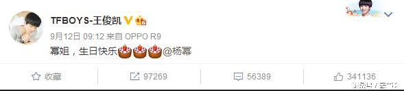 有小鲜肉王俊凯早上九点在微博上发文祝福写道:“幂姐,生日快乐。”看来这孩子还是懂事的孩子呀,让我们看到TFBOYS组合,就会让我们想起多年的“小虎队”,如今的小虎队们都已经成为了荧屏的大哥大,再也不会再去唱《一路顺风》《蝴蝶飞呀》等的小青春的歌曲了,如今他们成了70、80后的最美的回忆。而他们之后的TFBPYS似乎走得就是当年小虎队的路子。