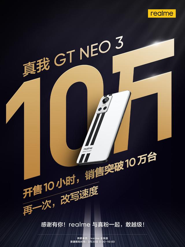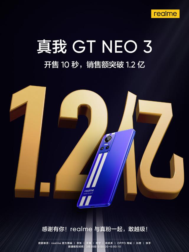 3月30日,科技潮牌realme真我的最新潮玩电竞旗舰真我GT Neo3正式开售,首销即爆款,根据官方发布战报:开售10秒销售额突破1.2亿,开售10小时销售突破10万台!