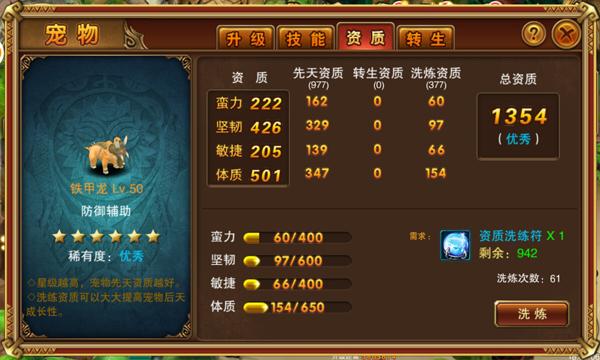 4.宠物资质有先天资质和转生资质和洗练资质3种,先天资质为宠物获得时就已经确定了,无法提升,而转生资质是在先天资质上得到强化,所以一个宠物的先天属性决定了以后的转生资质提升。转生资质可以通过宠物转生获得,最最关键的是洗练资质,洗练资质需要使用资质洗练符进行洗练才可以得到提升,并且提升空间非常大,如果提升满将会大大提高宠物能力!