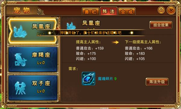 宠物阵法可以通过魔魂碎片得到提升,提升宠物阵法可以将上阵宠物的属性按比例加成到人物身上,不同的阵法效果也不同,后期宠物属性提升上去以后,给人物的加成是非常多的,而且也是最实在的战力!