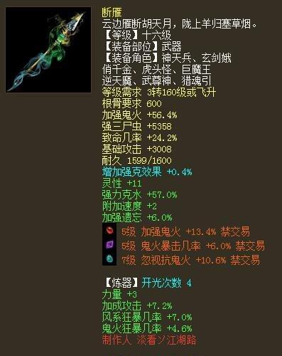 现在鬼族武器少,不像其它种族武器市场上随处可见,我想买一件强鬼火的剑刀,买了一个月也没买到,不得已,还是自己做吧。造了一把13级垃圾剑,拿盘古来洗。洗了十几次也没出强鬼火,倒出了个强三尸伤害。