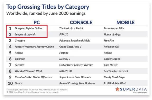 DNF和LOL制霸2020年6月PC端免费游戏收入榜