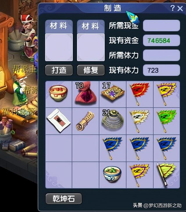 6、找帮派书院的福利总管修理装备。消耗10点帮贡、一定金钱和帮派资材。修理有一定几率会失败