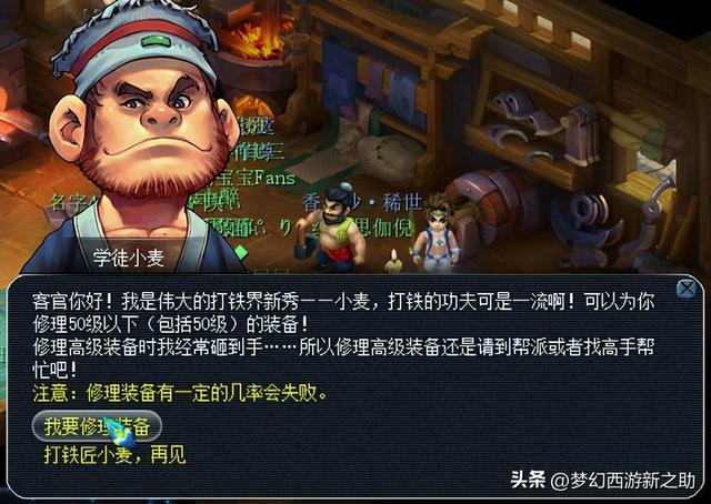 7、找长安城铁匠铺学徒小麦可以修理小于等于50级的装备。修理有一定几率会失败。