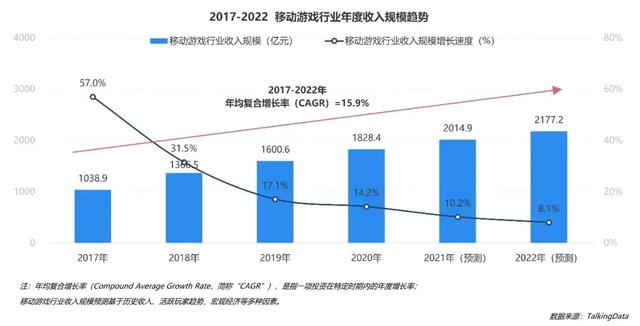 较为稳定的玩家群体、健康有序的市场环境、创新玩法的游戏研发,共同推动着移动游戏行业向好发展,预计2022年移动游戏行业收入将达到2177亿元,2017-2022的年均复合增长率为15.9%。