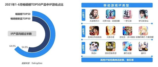 上半年畅销榜显示,TOP50产品中IP产品数量占比达64.0%,在新品TOP50中,IP产品数量也有54.0%。可见,当前市场对于IP产品的热衷,在获客越来越困难的情况下,IP加持无疑是快速获取用户的有利方式。而随着市场越来越成熟,IP的品类也越来越丰富,除了常见的小说、动漫、游戏IP外,还有如源自经典神话故事IP“山海经”的《妄想山海》,根据国风音乐IP改编的《忘川风华录》,都为IP产品类型多样化开辟了道路。