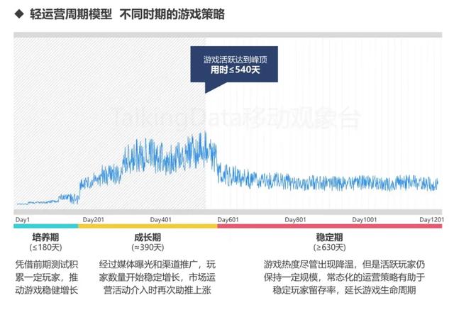 轻运营周期模型尽管游戏运营的强度有所减弱,但是在培养期之后,仍旧需要适时地利用游戏更新或产品迭代等方式,激发玩家的活跃热度,推动游戏进一步打开市场,成长期后游戏将会出现小幅的下滑,但是有效的运营策略则能维护游戏稳态,利于延长游戏生命周期。